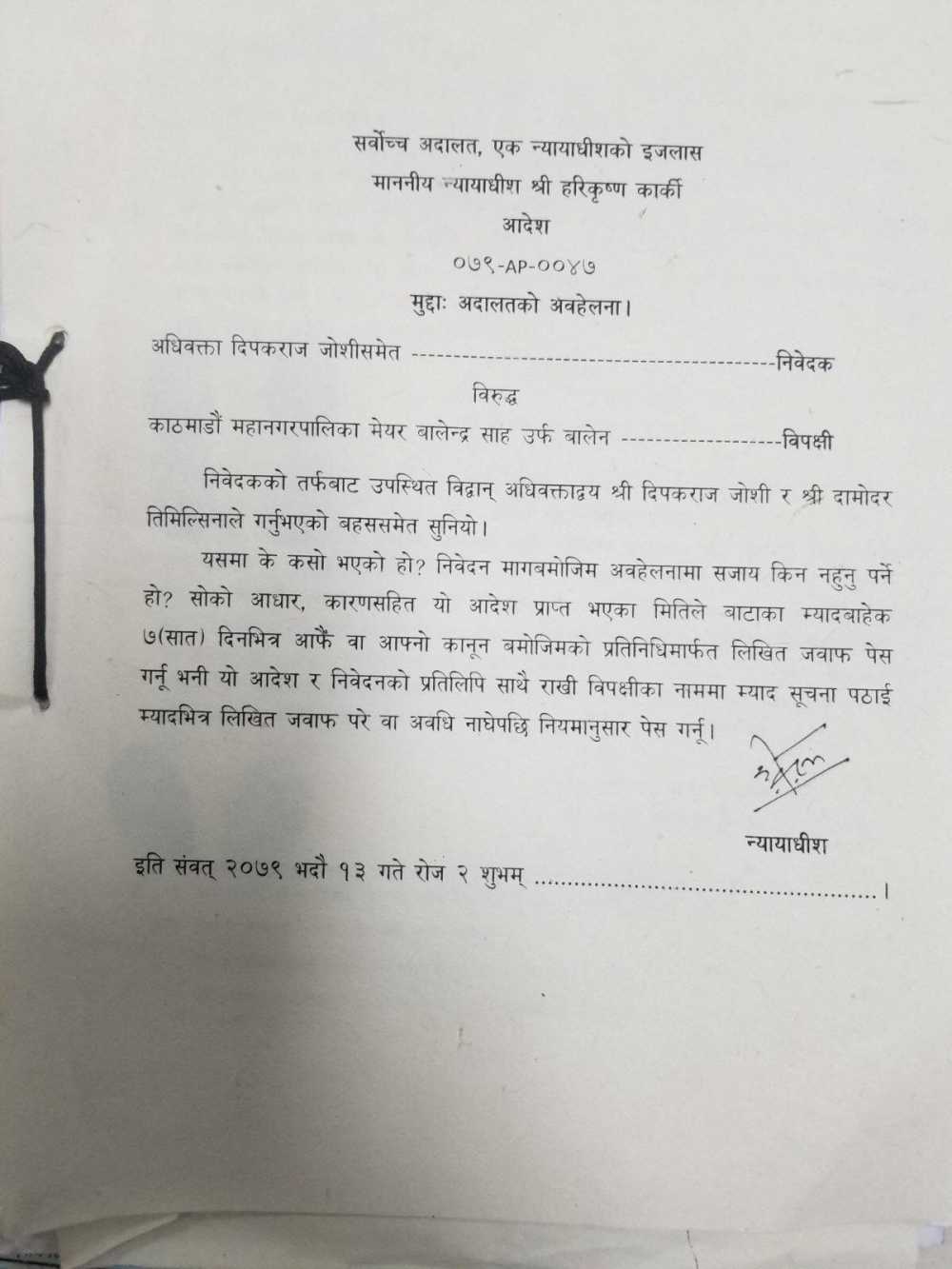 ‘निवेदन मागबमोजिम अवहेलनामा सजाय किन नहुनु पर्ने हो ? सोको आधार, कारणसहित यो आदेश प्राप्त भएका मितिले बाटाका म्यादबाहेक सात दिनभित्र आफैँ वा आफ्नो कानुनबमोजिमको प्रतिनिधिमार्फत लिखित जवाफ पेस गर्नु भनी यो आदेश र निवेदनको प्रतिलिपि साथै राखी विपक्षीका नाममा म्याद सूचना पठाई म्यादभित्र लिखित जवाफ परे वा अवधि नाघेपछि नियमानुसार पेस गर्नु’ सर्वोच्चको आदेशमा भनिएको छ ।