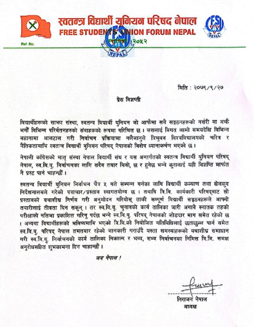 परिषद्का अध्यक्ष निराजन नेपालद्वारा जारी विज्ञप्तिमा स्वतन्त्र विद्यार्थी युनियन परिषद् नेपाल, स्ववियु निर्वाचनका लागि सदैव तयार रहेको भन्दै विद्यार्थी कल्याण तथा खेलकुद निर्देशनालयले चैत ५ गते स्ववियु निर्वाचनको मिति तोकेर गरेको पत्राचारको अक्षरंश पालना गर्न त्रिविलाई ध्यानाकर्षण गराएको छ ।