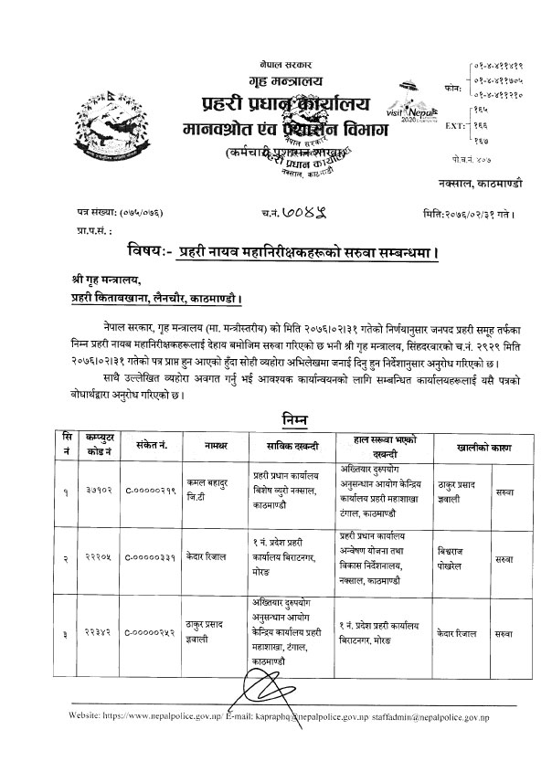 जुनियर प्रहरी एकेडेमी भरतपुरमा हरिभक्त प्रजापतिलाई जिम्मेवारी दिइएको छ भने सो एकेडेमीका महेन्द्र पोखरेको प्रहरी प्रधान कार्यालयको वृत्ति विकास निर्देशनालयमा सरुवा भएको छ । कर्णालीका प्रमुख महेशबिक्रम शाहको सुरक्षा परिषद्मा सरुवा भएको छ ।