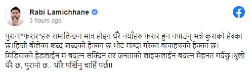 शनिबार सामाजिक सञ्जाल मार्फत उनले यस्तो बताएका हुन् । उनले सामाजिक सञ्जालमा भनेका छन्, 'पुराना "फरार"हरु समातिन्छन् मात्र होइन धेरै नयाँहरु फरार हुन नपाउन् भन्ने कुराको हेक्का छ । हिजो बोलेका शब्द शब्दको हेक्का छ, भोट माग्दा गरेका वाचाहरुको हेक्का छ।मिडियाको हेडलाईन म बदल्न सक्दिन तर जनताको लाइफलाईन बदल्न मेहनत गर्दैछु । धुलो धेरै छ, पुरानो छ. थोरै पर्खिनु चाहिँ पर्छ! '